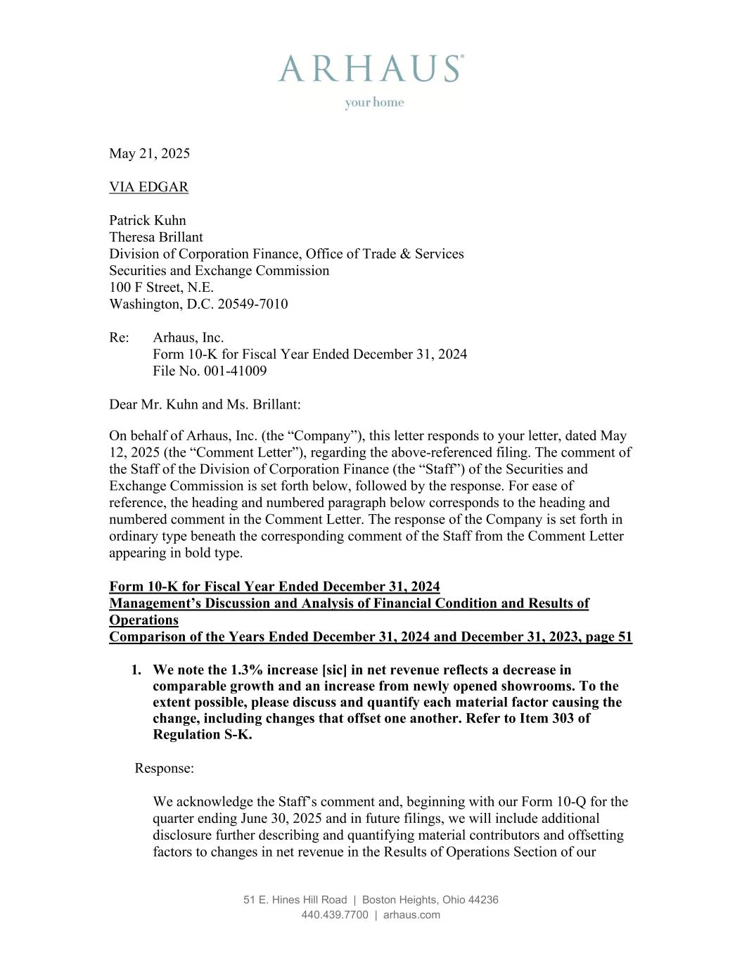51 E. Hines Hill Road | Boston Heights, Ohio 44236 440.439.7700 | arhaus.com May 21, 2025 VIA EDGAR Patrick Kuhn Theresa Brillant Division of Corporation Finance, Office of Trade & Services Securities and Exchange Commission 100 F Street, N.E. Washington, D.C. 20549-7010 Re: Arhaus, Inc. Form 10-K for Fiscal Year Ended December 31, 2024 File No. 001-41009 Dear Mr. Kuhn and Ms. Brillant: On behalf of Arhaus, Inc. (the “Company”), this letter responds to your letter, dated May 12, 2025 (the “Comment Letter”), regarding the above-referenced filing. The comment of the Staff of the Division of Corporation Finance (the “Staff”) of the Securities and Exchange Commission is set forth below, followed by the response. For ease of reference, the heading and numbered paragraph below corresponds to the heading and numbered comment in the Comment Letter. The response of the Company is set forth in ordinary type beneath the corresponding comment of the Staff from the Comment Letter appearing in bold type. Form 10-K for Fiscal Year Ended December 31, 2024 Management’s Discussion and Analysis of Financial Condition and Results of Operations Comparison of the Years Ended December 31, 2024 and December 31, 2023, page 51 1. We note the 1.3% increase [sic] in net revenue reflects a decrease in comparable growth and an increase from newly opened showrooms. To the extent possible, please discuss and quantify each material factor causing the change, including changes that offset one another. Refer to Item 303 of Regulation S-K. Response: We acknowledge the Staff’s comment and, beginning with our Form 10-Q for the quarter ending June 30, 2025 and in future filings, we will include additional disclosure further describing and quantifying material contributors and offsetting factors to changes in net revenue in the Results of Operations Section of our